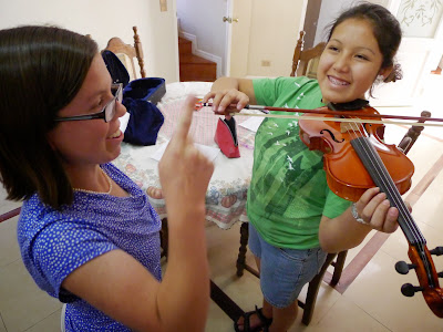 Callie Dean, composer (left) and Liezbeth Salvatirra, translator (right) practice violin in Cochabamba |