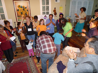By the last night, it was obvious that the children had become used to our routine. They crossed the threshold confidently, participated in the opening ritual, and remembered the words and dance moves to some of the Spanish children's songs. Even though the art projects were different each night, we kept a measure of repetition so that the process was familiar (i.e. each night we created some sort of collaborative art project, in which the children created or decorated elements of a scene and then decided where each would go). Even on Friday, some of the children still demonstrated separation anxiety when they had to leave their parents; however, others participated more readily than in previous nights. We closed with the rest of the classes for a Celebration, in which we set out a gallery of the children's work and led a dance for the adults, who had just received their certificates. The celebration, and the children's class in general, provided a tangible expression of the concepts that the adults had learned all week: creating safe spaces, using the arts for education and spiritual development, and facilitating healthy development through the arts.