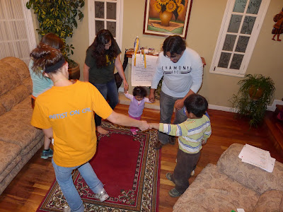 With a better idea of the challenges and flow of the evening, we spent several hours devising activities and creating a schedule for the class (which included new activities every 10 minutes and alternated visual arts and music). We began noticing the phrases that we wanted to use most often, and we looked them up in Spanish ahead of time. We even were able to make a run to the store for some basic art supplies! In addition, we decided to move to the living room, which was more open and thus better suited for our music and dance experiences. The evening went smoothly, and the children stayed engaged throughout most of the class. However, the living room was right near the house's main entrance, so people (including the children's parents) were constantly coming and going, disrupting the flow of the classroom. In our debriefing we concluded: